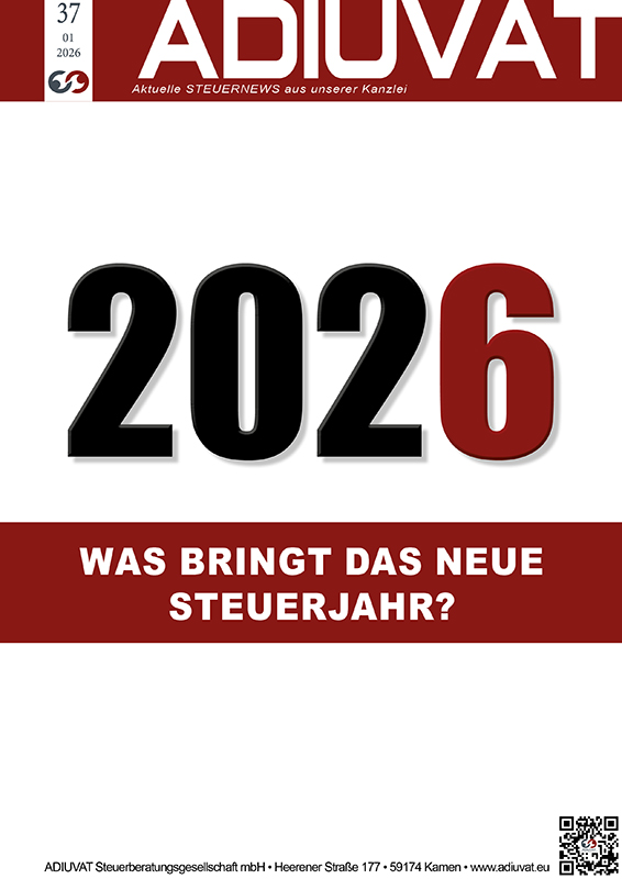Unser aktuellstes Kanzleimagazin, Nummer 37/2026, steht für Sie online bereit. Hier finden Sie interessante Steuer-News für den Monat Januar 2026.